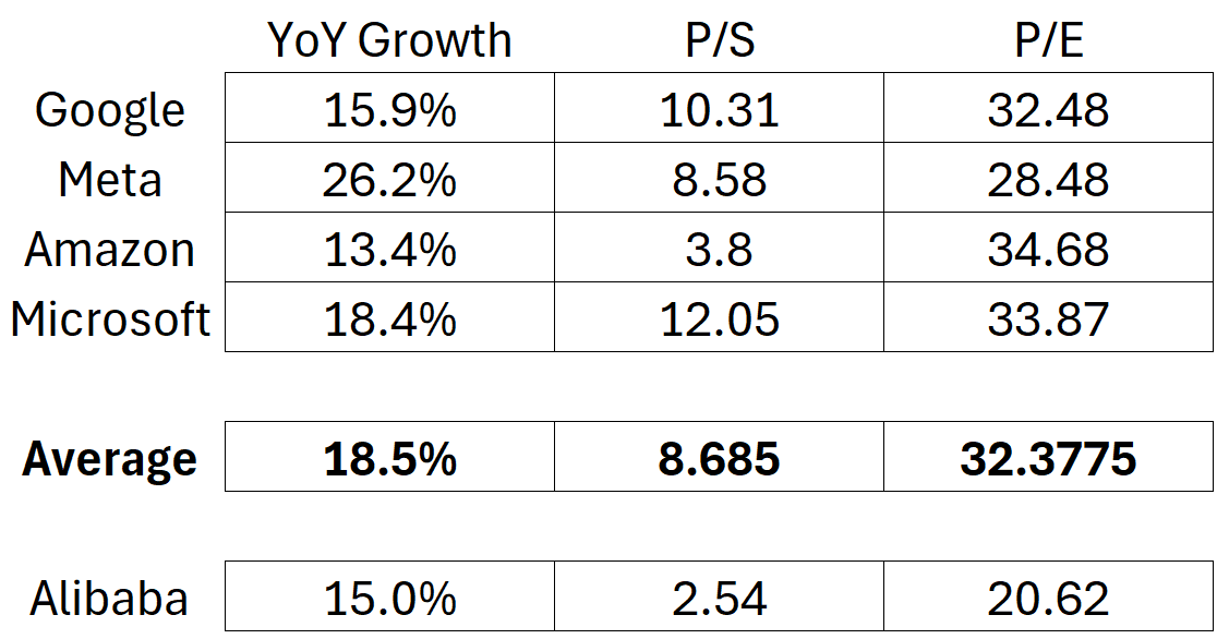 My directional bias was shared above, I believe Alibaba compares to U.S. tech names and should trade comparable to them. Why not? They offer comparable services in very large geographies with very high demand. The actual lower multiples are due, to my opinion, to distrust from Americans in China and this “lower growth” illusion. And you understood I expect both to disappear in the next quarters, while AI demand is clearly booming everywhere, Asia included. The challenge for Alibaba is to monetize its services to the level U.S. techs did, which is harder to do in a less consumption focused economy, but can be done nonetheless as mentalities change.