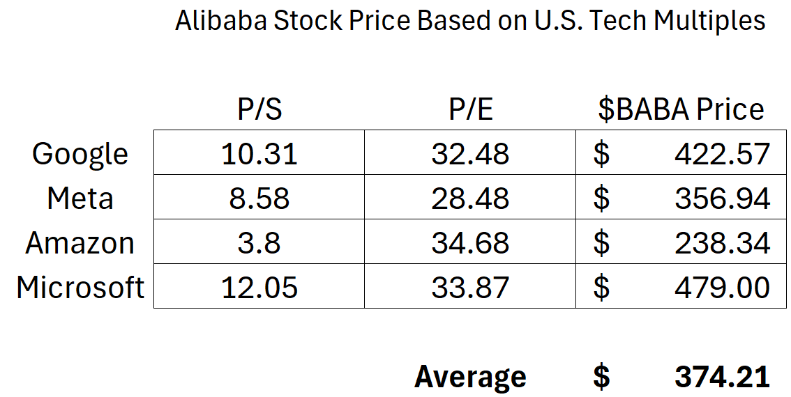 Realistically, even in a Chinese bull run, I don’t expect Alibaba to trade at U.S. level multiples. So this $350+ isn’t my expectation, it is only to illustrate. Apply a growth adjustment and a China discount - which will always exist, and you’d have a target.