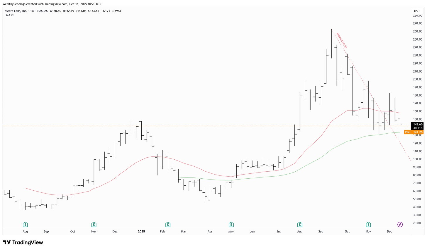 In terms of price action, the market has been violent lately, selling off many smaller-cap stocks out of fear that large commitments will disappear. However, AsteraLabs is holding above its weekly 50 and is ranging near its earlier ATH. Hopefully, the ATH will continue to act as support, because breaking lower could open the door to lots of pain, for longer. And that’s a tough spot to be in when holding a stock.