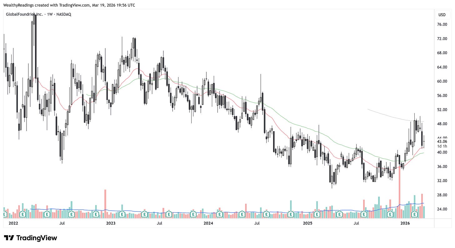 GlobalFroundries is one of the key player of the sector. As I said earlier, I found it pretty randomly through my screeners and it surprised me as they are build to find potential/starting uptrend: higher lows/highs, high volume and breaking out their W50. This is partly why I believe there is something here.