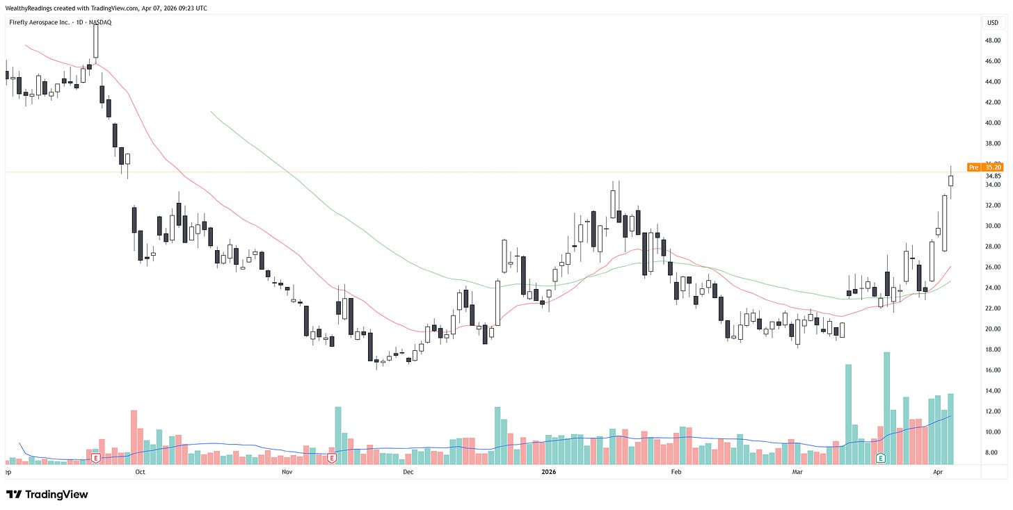 Without any surprises, IM is pushing higher and meeting my criteria - growing volume on rising stock with breakouts, and Firefly Aerospace which is also a publicly traded company (IPOd in 2025 so chart is in daily timeframe) has the exact same profile. Same sector, same tailwinds, same momentum.