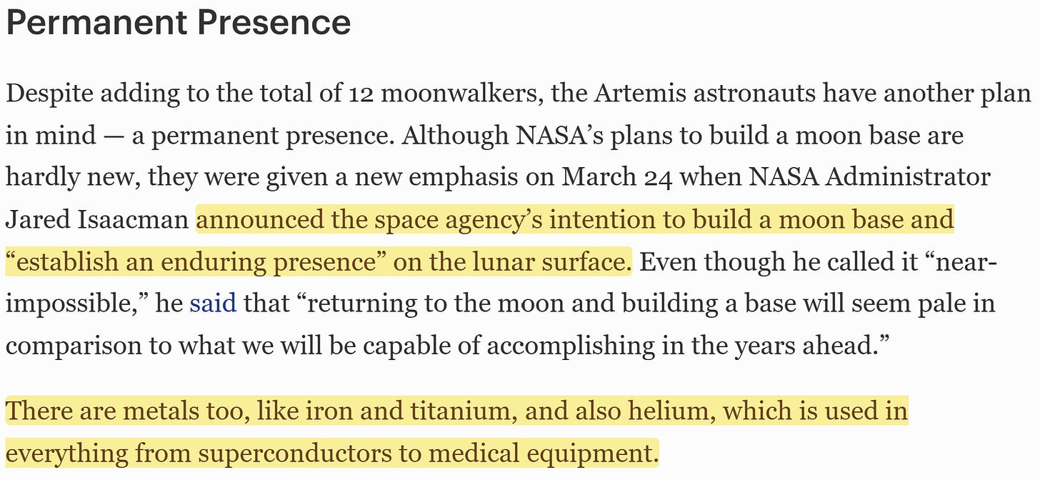 This is our generation’s space conquest and it is a very serious one which the U.S. intend to win. If you wonder why, the answers are simply: the moon is filled of key resources we’d love to extract, its gravity and conditions make it an interesting geography for any kind of manufacturing (pharmaceuticals and semiconductors are already being manufactured in space with many advantages), plus the need to make humanity an interplanetary species.