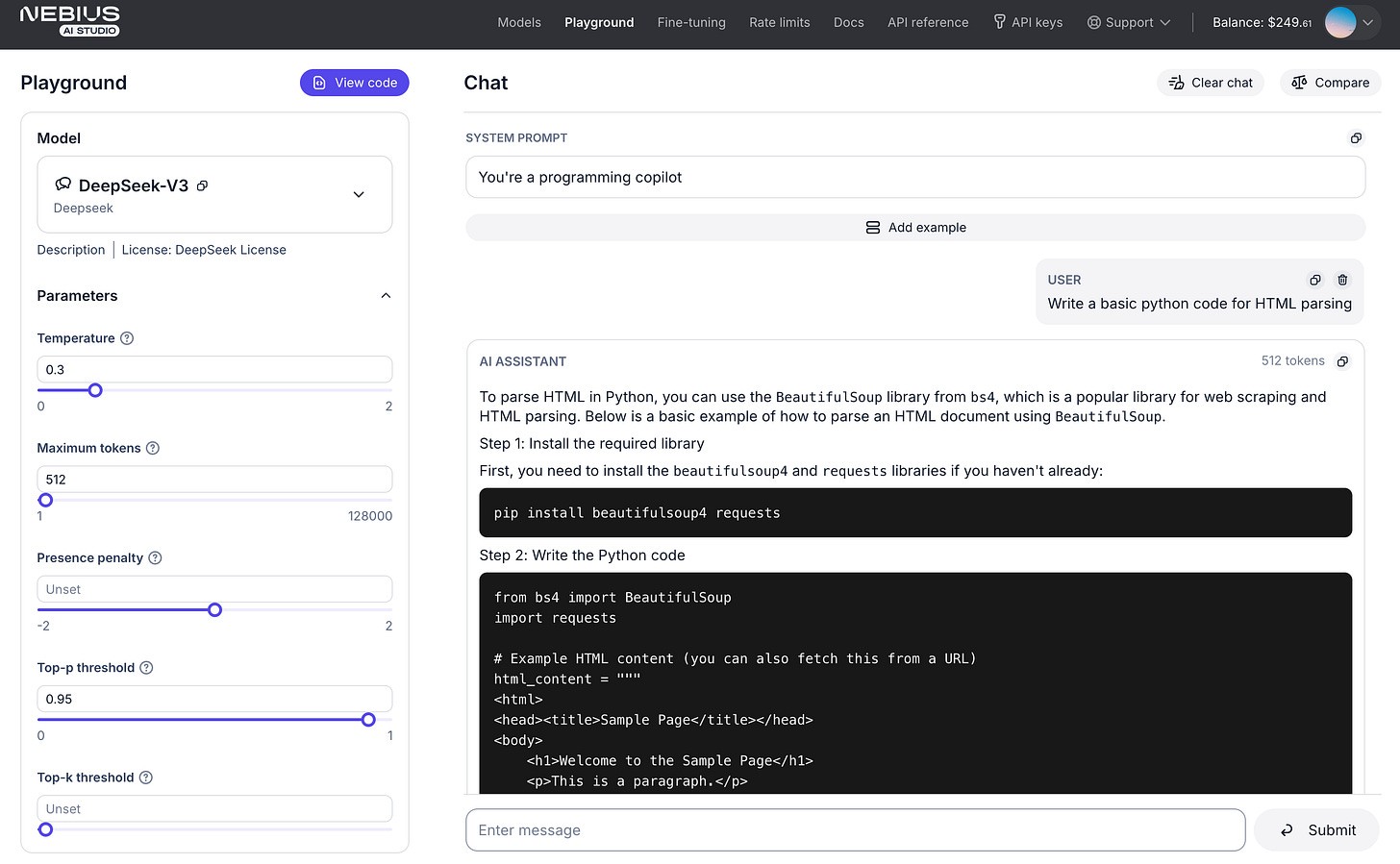 Nebius Studio simplifies even more application development for model users and app builders, by allowing developpers to play with different parameters in order to find the best set up for their models.