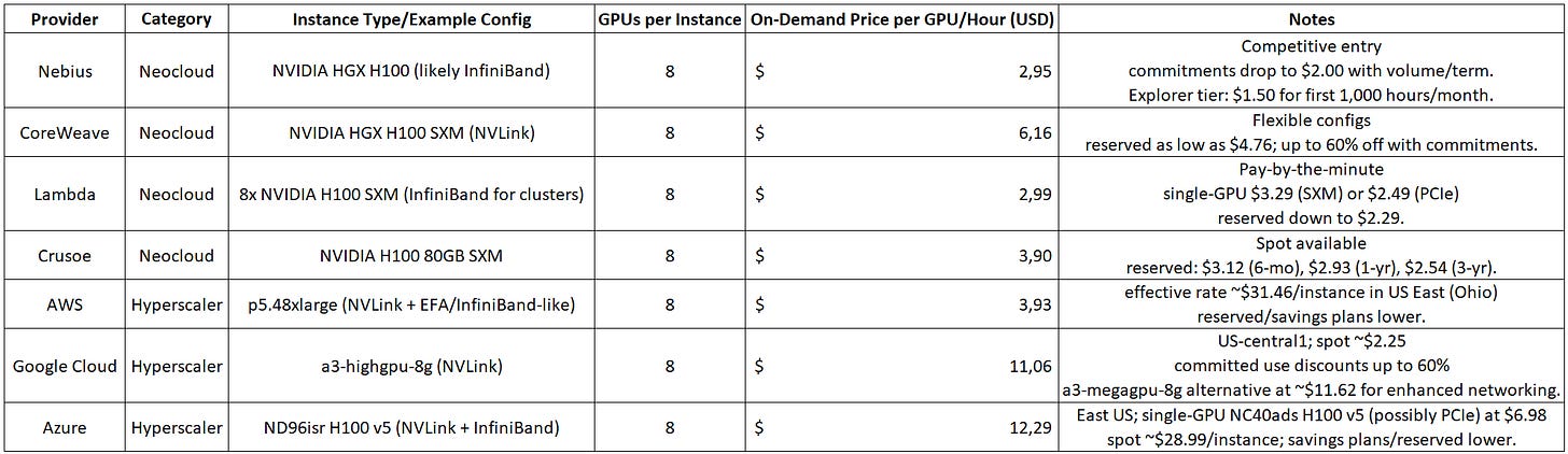 Data is clear in term of pricing. As for Nebius’ compute quality, it usually matches or exceeds other neoclouds & hyperscalers across most metrics, often ranking highest in peak capacity without specific model requirements. You can play and compare with other providers here.