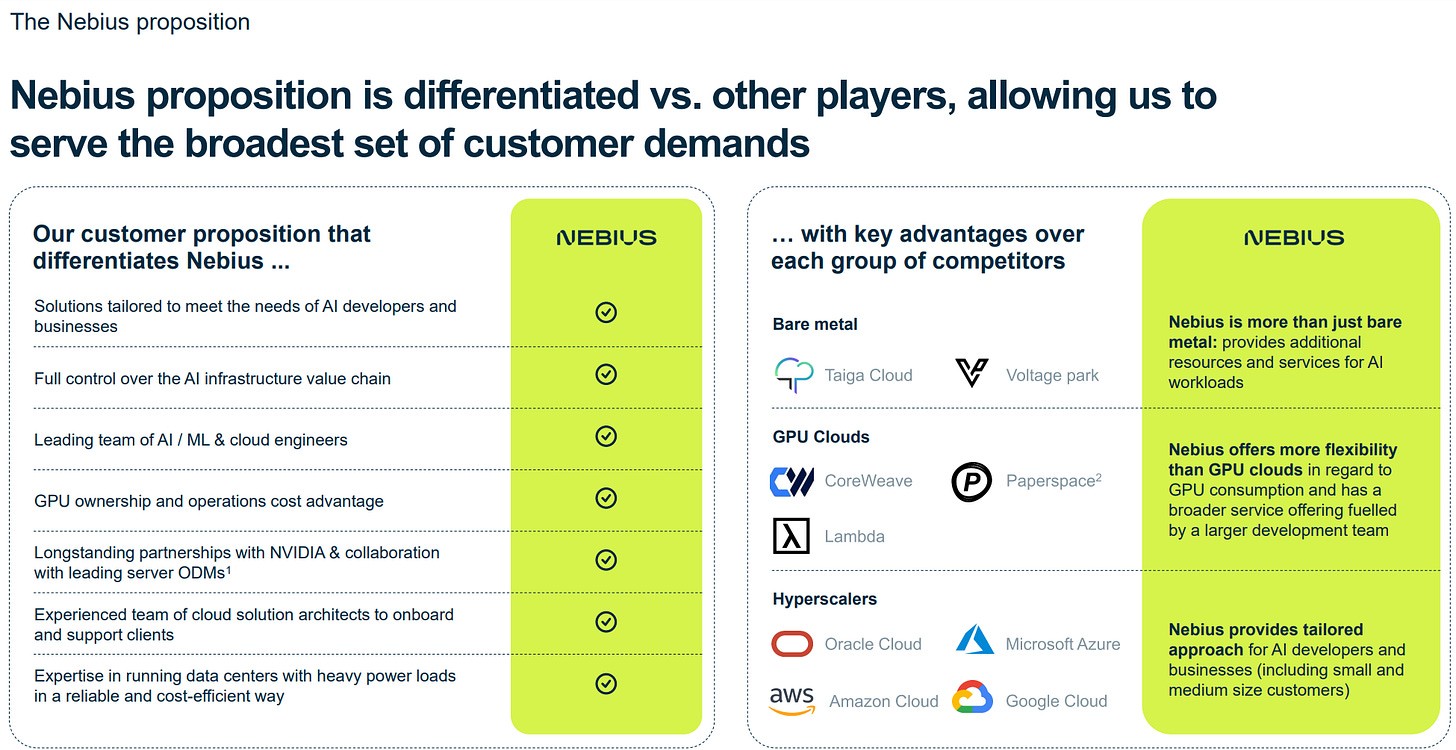 This vertical integration enables Nebius to offer the best price-to-quality ratio in the market and could set them apart for years as catching up will take time for competition.