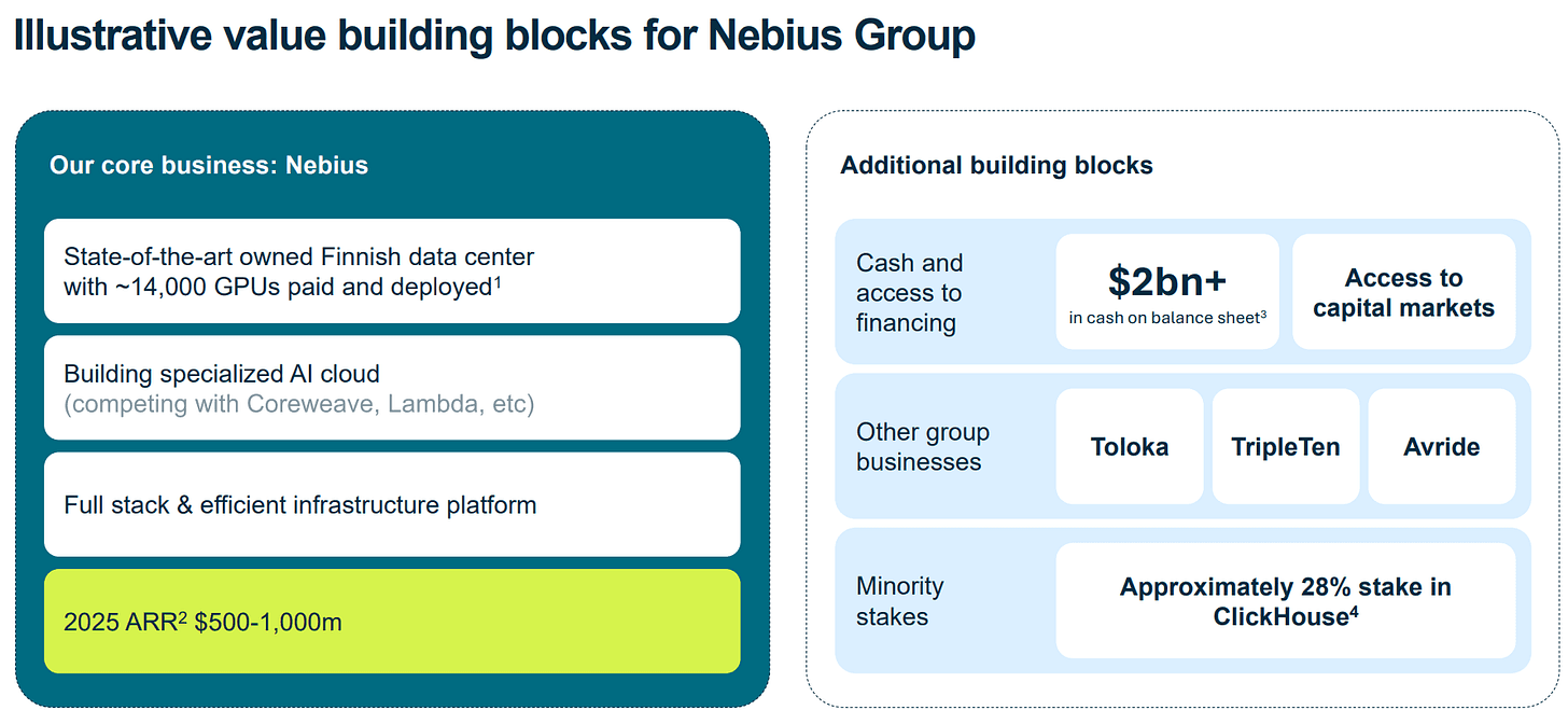 Nebius owns a 28% stake in ClickHouse. Like for Toloka, management confirmed they could use this equity to fund the core business.