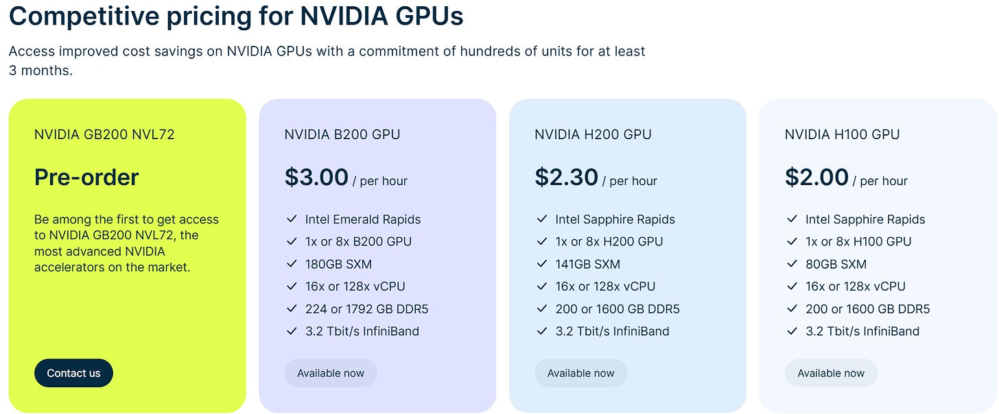 Focusing on Nebius, their business model is to rent GPUs based on their clients’ exact consumption rather than forcing contracts with fixed durations or minimum compute usage. This flexibility increases demand but also business risk - fixed contracts provide more stability. They also allow their users to plan GPU usage or to rent for a period. It isn’t only per hour, first come first serve, they have a wide range of possibilities but chose to start their offer from a very fexible model.