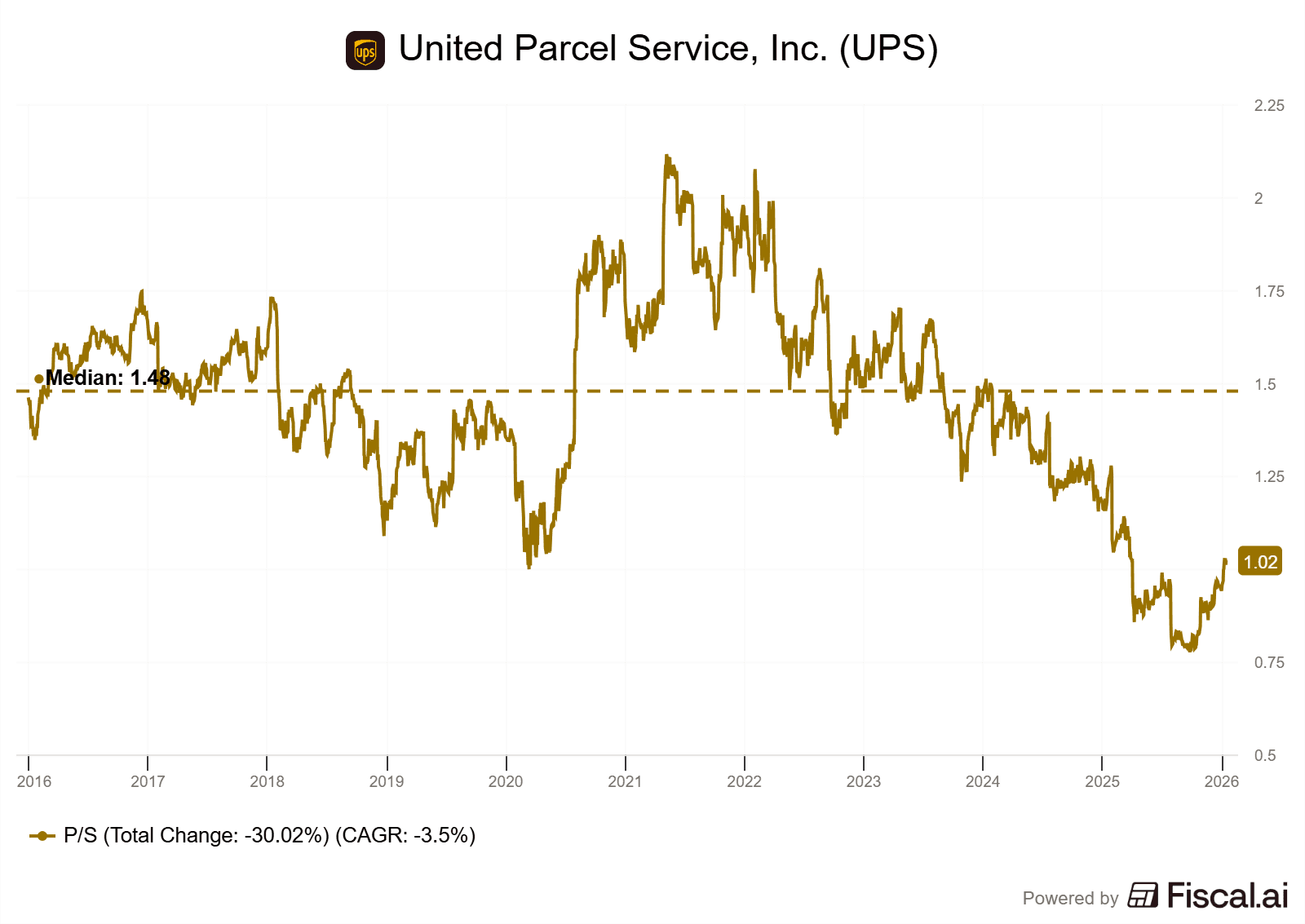 Target. We’d need a 50% gain to reach UPS median P/S, pushing the stock ~$150. A bit higher but let’s keep it conservative.