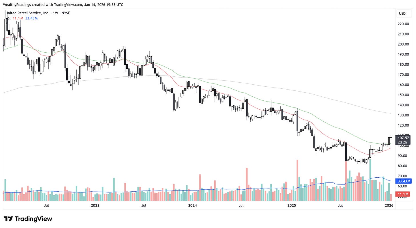 UPS has been in 4Y downtrend. It hasn’t stayed above its Weekly 50 or 21 - green and red line respectively, for more than a handful weeks.
