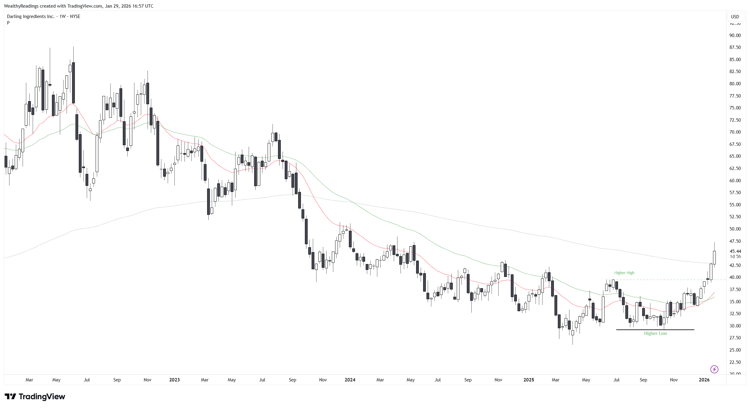 Processes animal waste to create food and fuel products. With regulatory frameworks now requiring oil and polluting companies to purchase credits, Darling's secondary business of selling those credits should accelerate growth. A defensive asset trading at low valuation with growth acceleration potential — and the market loves defensive assets lately.